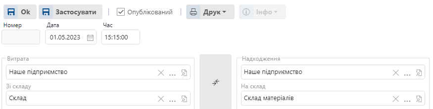 Документ складається з двох блоків: шапка с основними відомостями, перелік товарів, які треба перемістити.