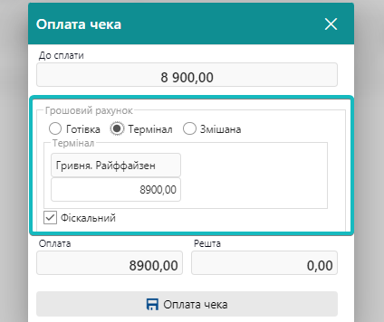 У вікні оплати треба обрати спосіб - готівка, термінал чи змішана форма оплати.