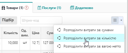 Вид розподілення - як потрібно розподілити суму за товарами (загальну суму всіх накладних)