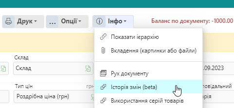 Щоб відкрити історію документа треба в ньому натиснути на меню Інфо.