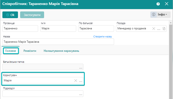 Тут необхідно обрати, з яким користувачем системи пов'язана картка співробітника, яку будемо у майбутньому застосовувати у документах нарахування ЗП.
