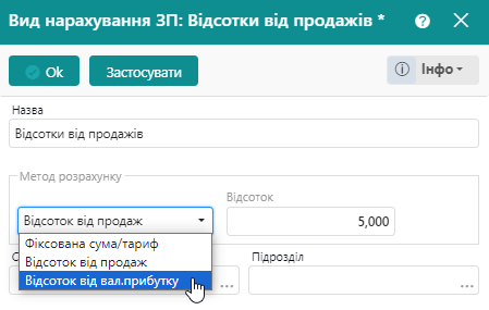 Щоб створити статтю нарахування відповідного типу, треба обрати відповідний метод розрахунку.