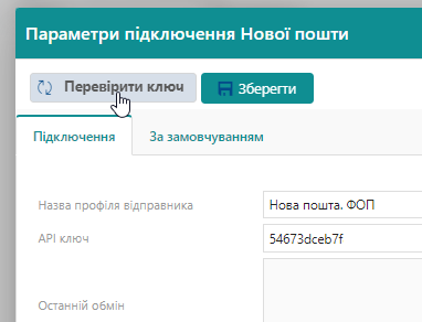 Якщо ключ успішно пройшов перевірку, то автоматично у картці інтеграції заповнюється інформація з кабінету Нової Пошти: