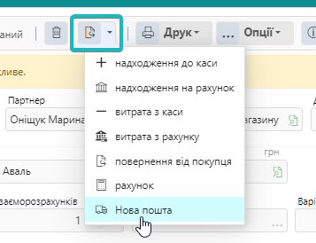 Натискаємо на кнопку "Створити на підставі" і обираємо Нова пошта