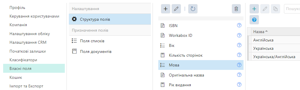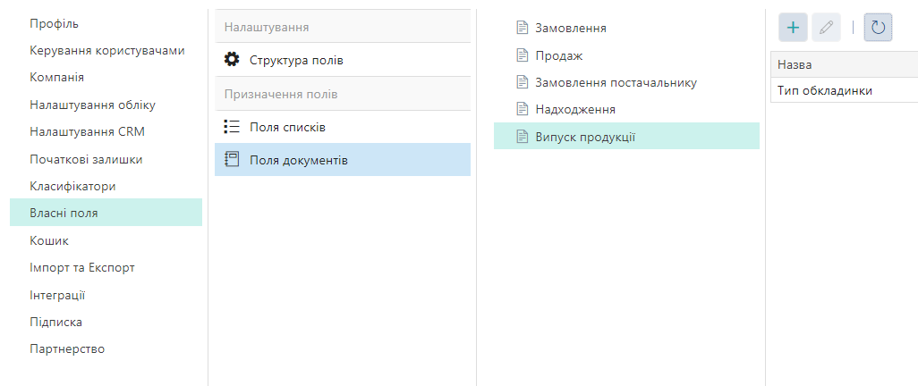 Готові власні поля можна призначити потрібному типу списків чи документів.