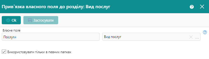 Для цього треба встановити відповідну позначку в прив'язці власного поля до розділу та відмітити потрібні папки із переліку.