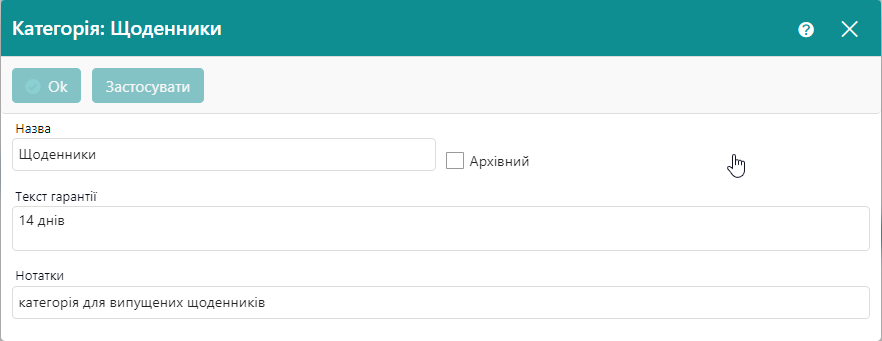 Таким чином для кожної категорії можна додати окремий текст для друку гарантії.