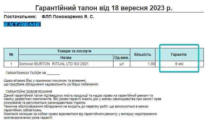 Якщо текст гарантійного талону для всіх товарів однаковий, то достатньо тут додати текст, який буде виводитись на друк.