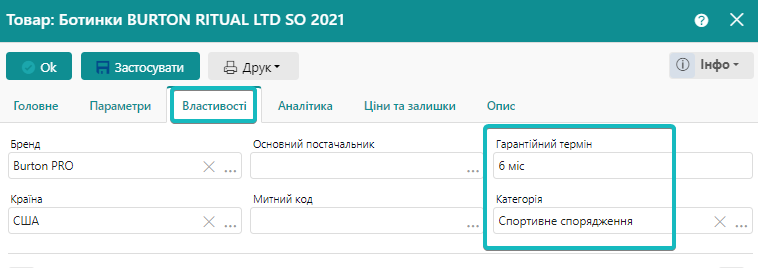 У картці товару можна обрати категорію і прописати гарантійний термін, який також буде виводитись на друк.
